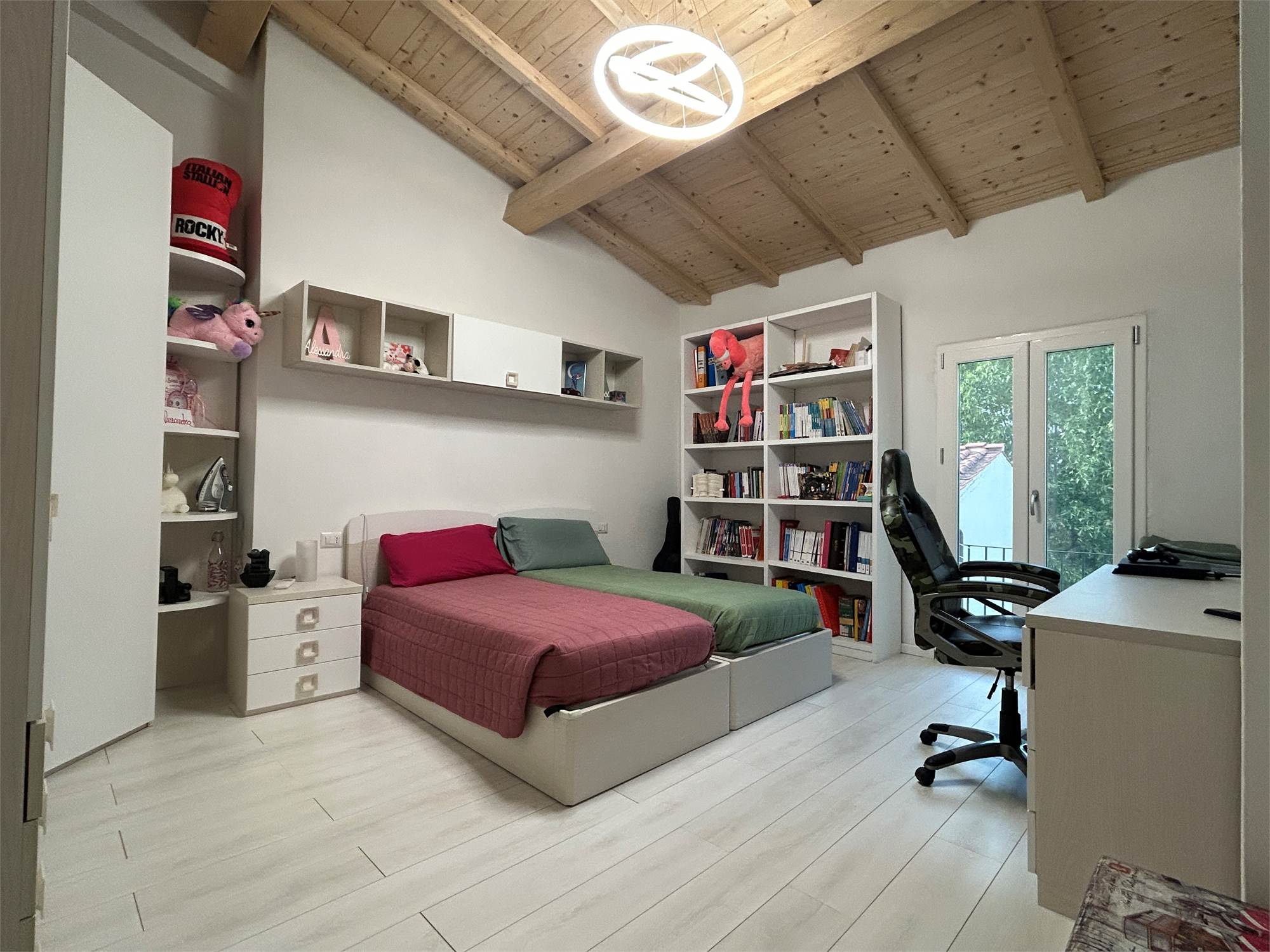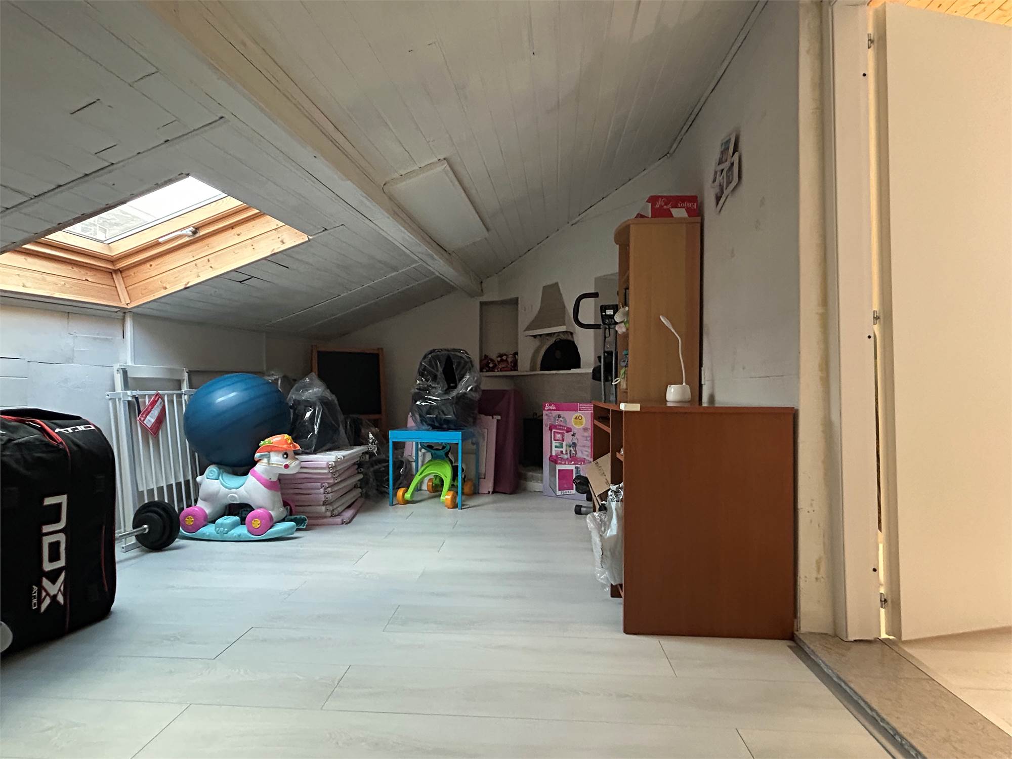 Al secondo livello mansardato oltre a uno studio con caminetto, si trova la seconda effettiva camera matrimoniale (con altezza che la rende abitabile) con bagno en-suite e caratteristico terrazzino con ripostiglio.