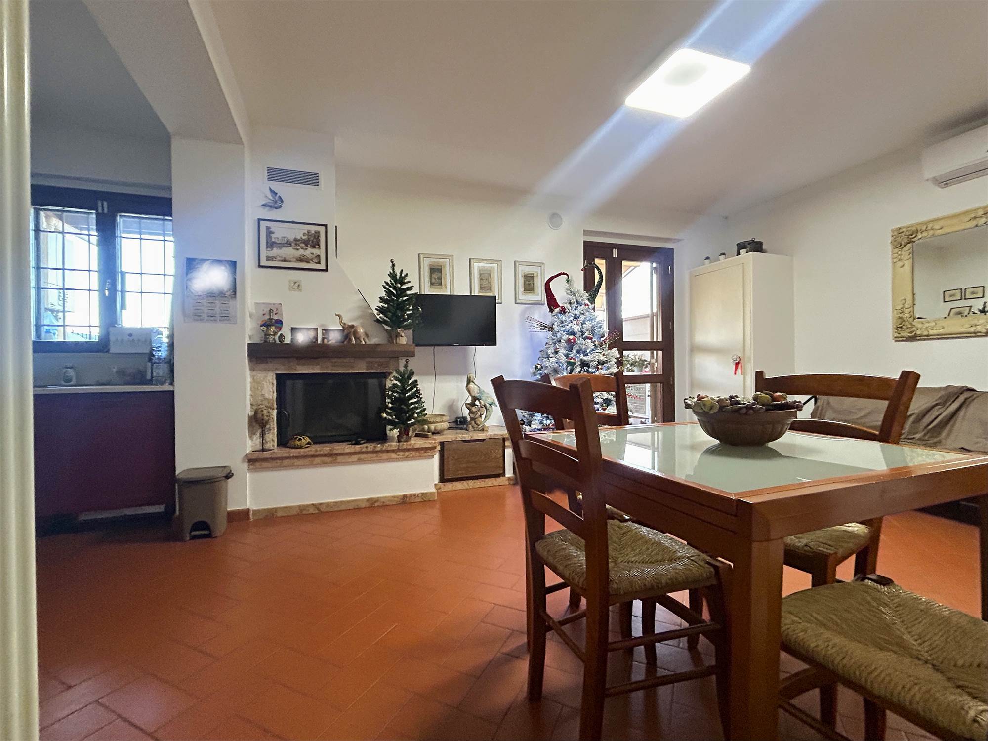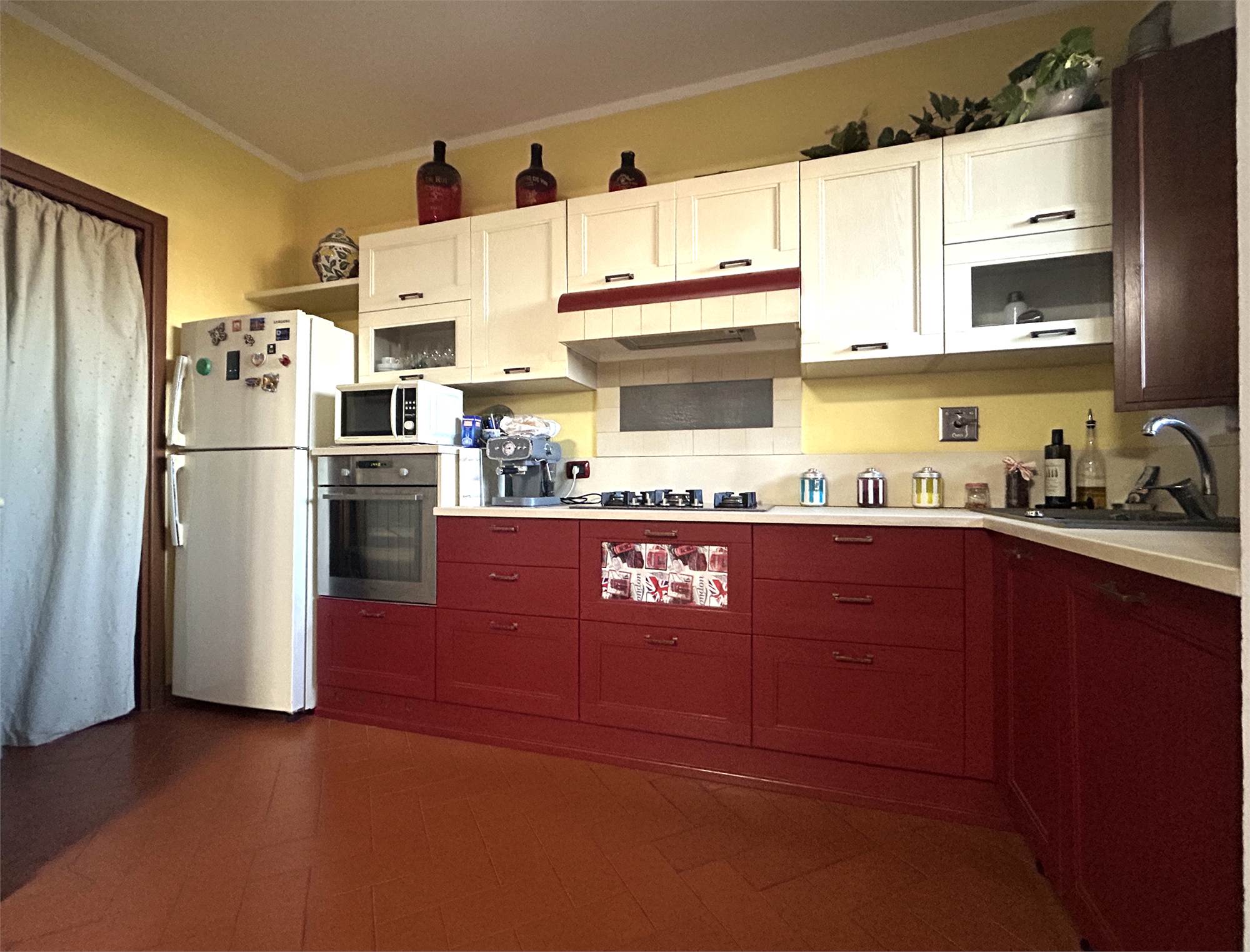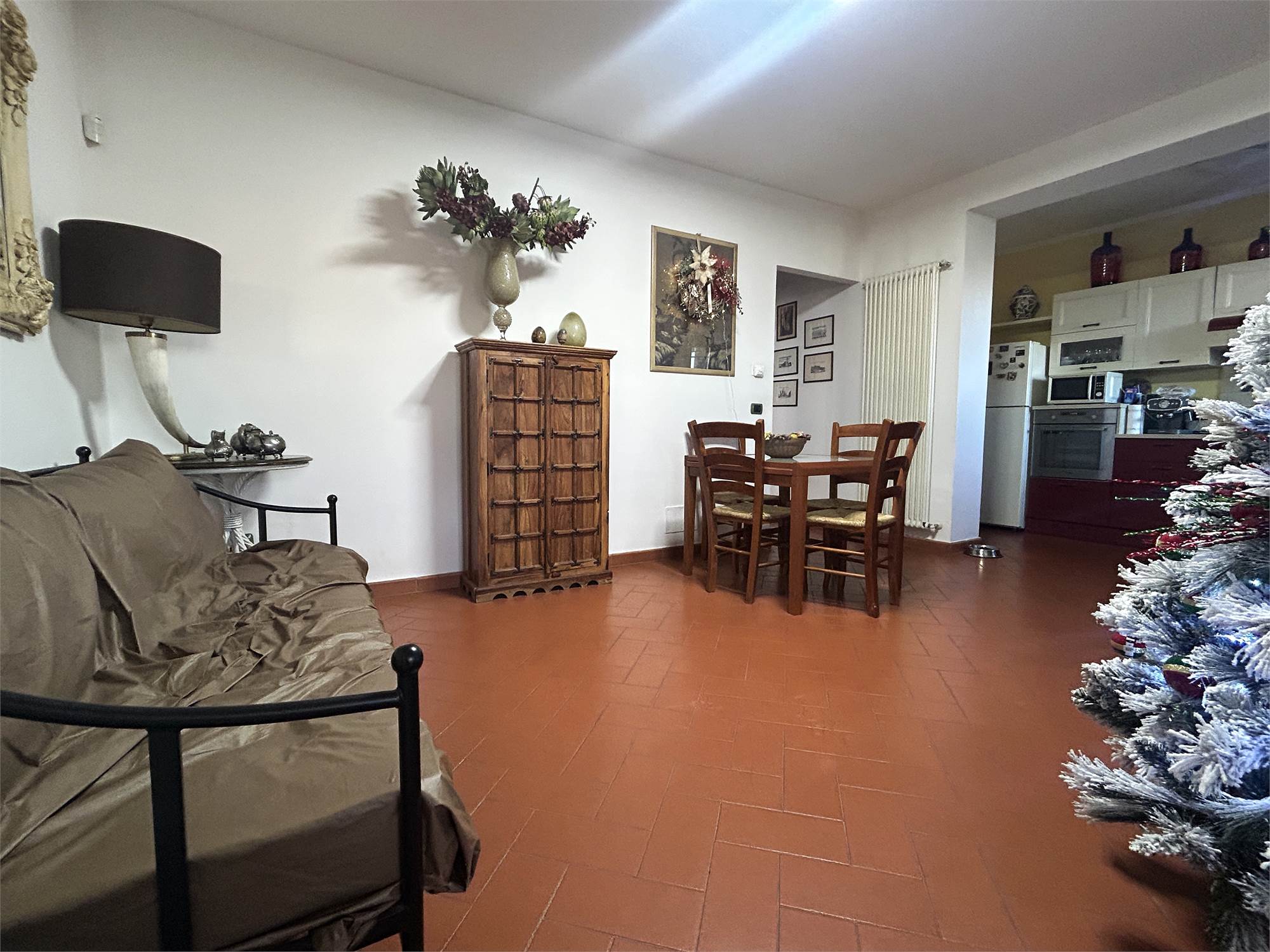 L’ingresso apre sulla zona giorno luminosa con cucina a vista, completa di comodo ripostiglio.